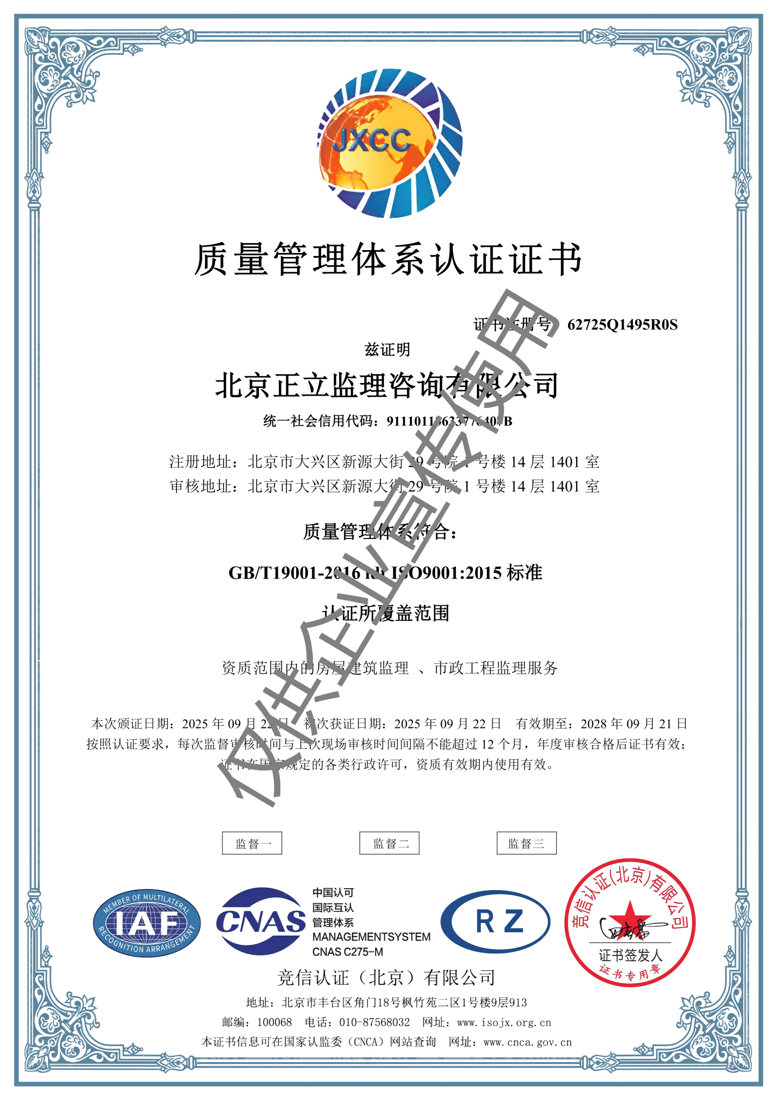 北京正立監(jiān)理咨詢有限公司成立于1998年7月1日,其前身隸屬于北京市公路質量監(jiān)理站。具有獨立法人資格,是獨立核算、自負盈虧的經(jīng)濟實體。企業(yè)經(jīng)營范圍:公路工程監(jiān)理、交通工程監(jiān)理、市政公用工程建設監(jiān)理、工業(yè)與民用建筑工程監(jiān)理、工程監(jiān)理咨詢、技術咨詢、技術培訓等。